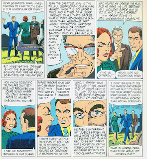 Mullany’s criticism reflects a common belief about comics storytelling: comics is primary a visual medium and so the text must always be dramatically subordinated (at least in terms of the amount of space it fills per panel) to the image. But I think the intensity of Ditko’s sequence visually depends upon the fact that, moving through the first three panels, the words take up an increasing amount of space as the image area decreases (with the fourth panel echoing the first):