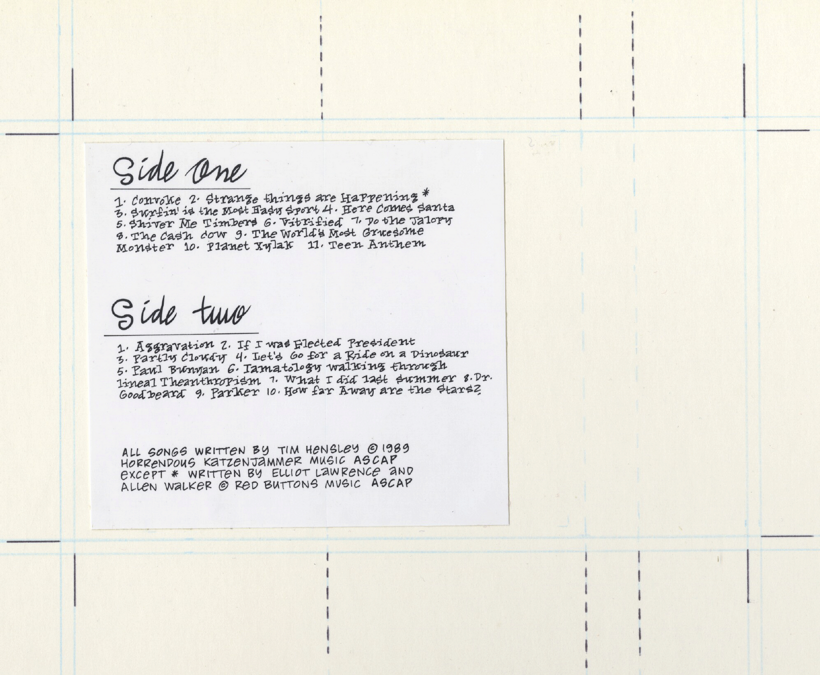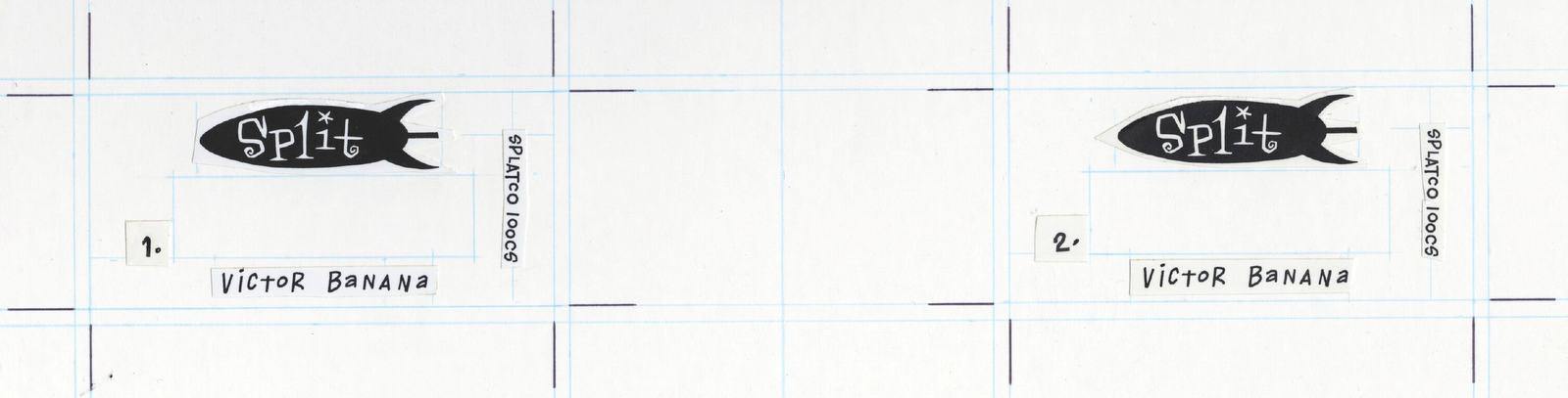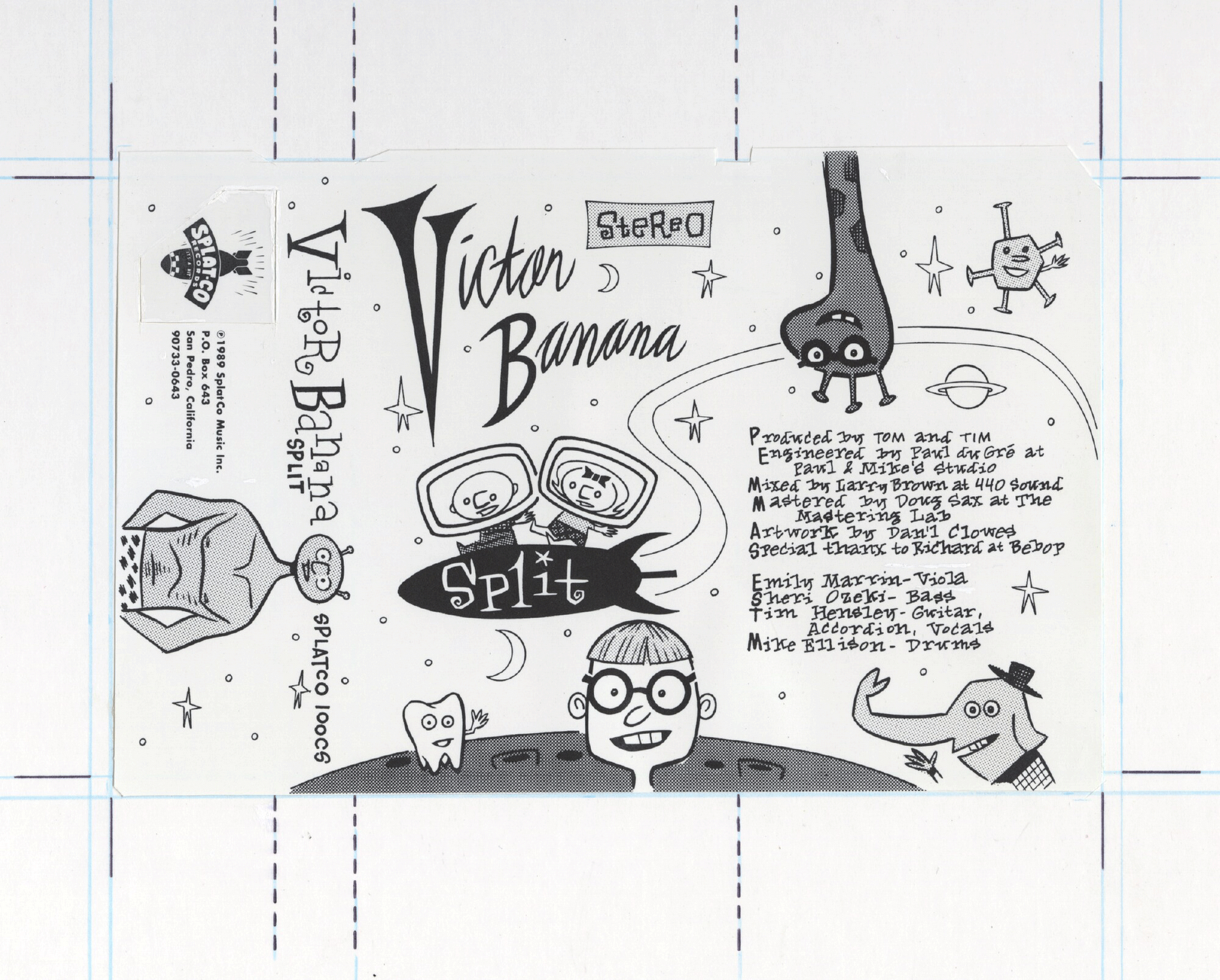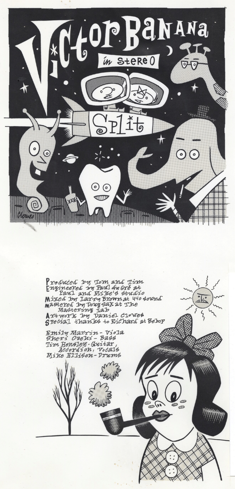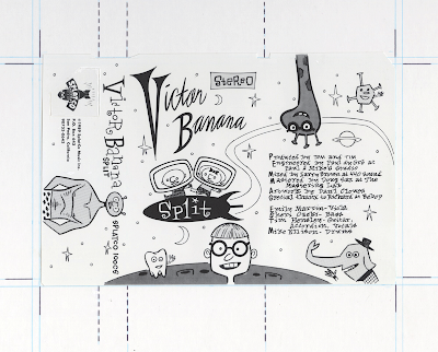 Here is unused artwork by Daniel Clowes for Victor Banana's album Split. I think I may have pasted these up around the same time the Neil Smythe CD was being mastered. The Like a Velvet Glove Cast in Iron soundtrack had sold well enough to break even, so, drunk with power, I assumed I would be able to release a whole line of products. There's a panel in the Like a Velvet Glove Cast in Iron book this reminds me of--a character admonishes, "I'm sick of everybody using my store as a through street!" Since the formats are now forgotten, I've posted these templates for any old-timer who wants to make a cassette for their big rig.