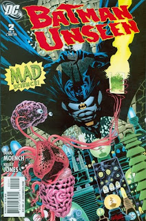 A few days back, I wrote an appreciation-analysis of Moench, Jones, and Madsen's Batman Unseen #1 and #2. The comics racks at my local shop has somewhere around 70 new comics today -- and Batman Unseen #3 is the only cover to have a word balloon. This choice clearly seems to be part of the author's decision to evoke a retro feel, and though a word balloon on a cover shouldn't seem like a risk, given current trends, it almost seems a little subversive; and it's a small reason why this comic stands out to me . . .