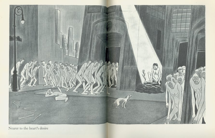 It would be easy to read this drawing as a condemnation of the character in the sunbeam, who seems completely oblivious to the suffering around him. (He looks at the dog, not at the parade of people). In this way, he seems to share the sense of self-delusion often possessed by Dean's main characters. But here, as elsewhere, Dean's comments show an appreciates for those who try to imagining new ways of seeing, thinking, and making art. Even if the result appears comical (an ordered mound of dirt and water), it shows a desire to imagine -- and to try to create -- a better reality, one that can have positive social consequences.