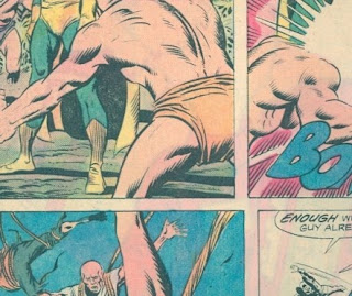 On the first reading, the connections felt like a flaw to me, but looking at the sequence again, I'm not so sure. When you take in the page as a whole, they give the fight a sense of circular motion. Or they're a result of questionable planning. . . [The cover of the issue is by Kirby and Ayers]